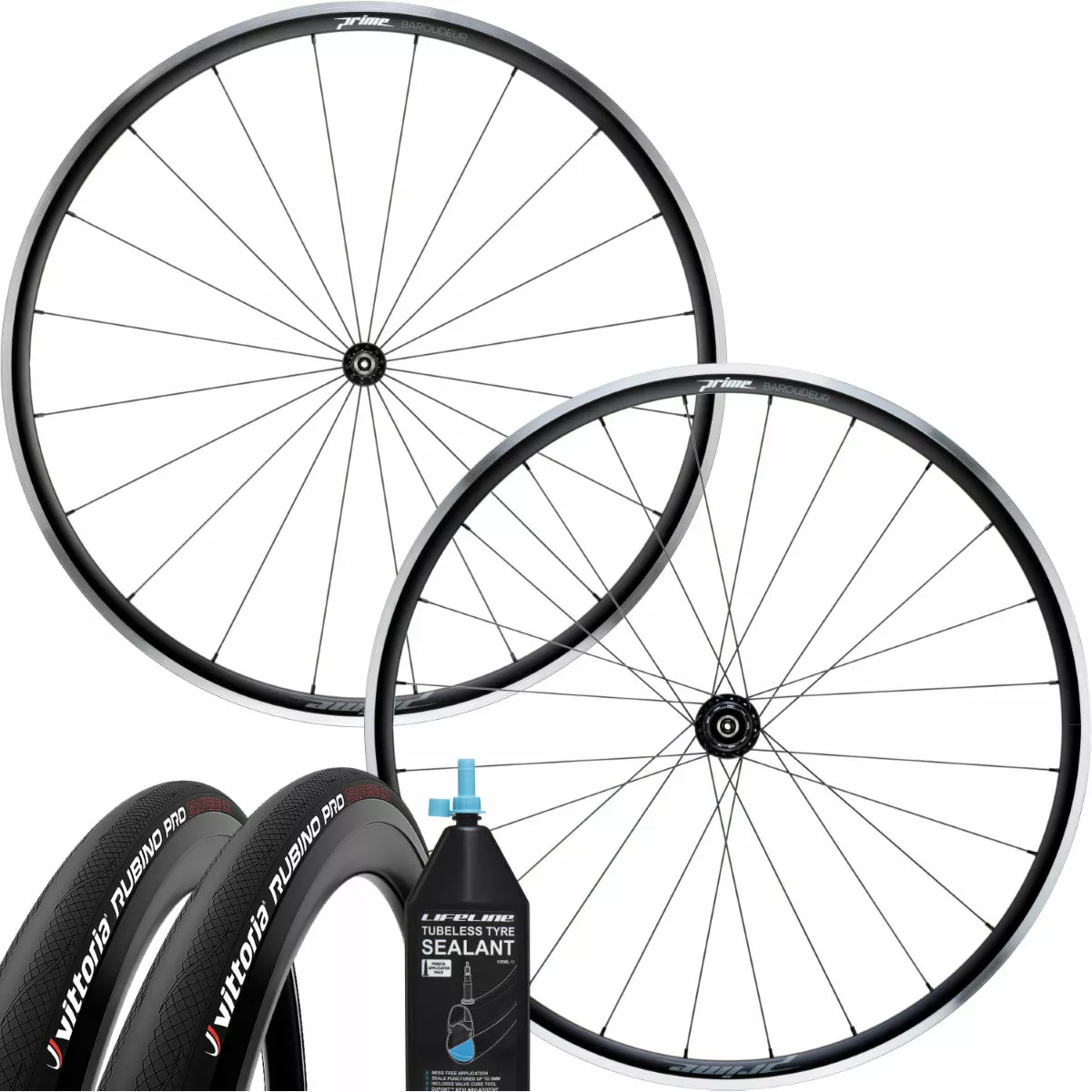 This exclusive bundle includes a Prime Baroudeur Wheelset, two Vittoria Corsa Rubino Pro IV tyres and Lifeline sealant 150ml.