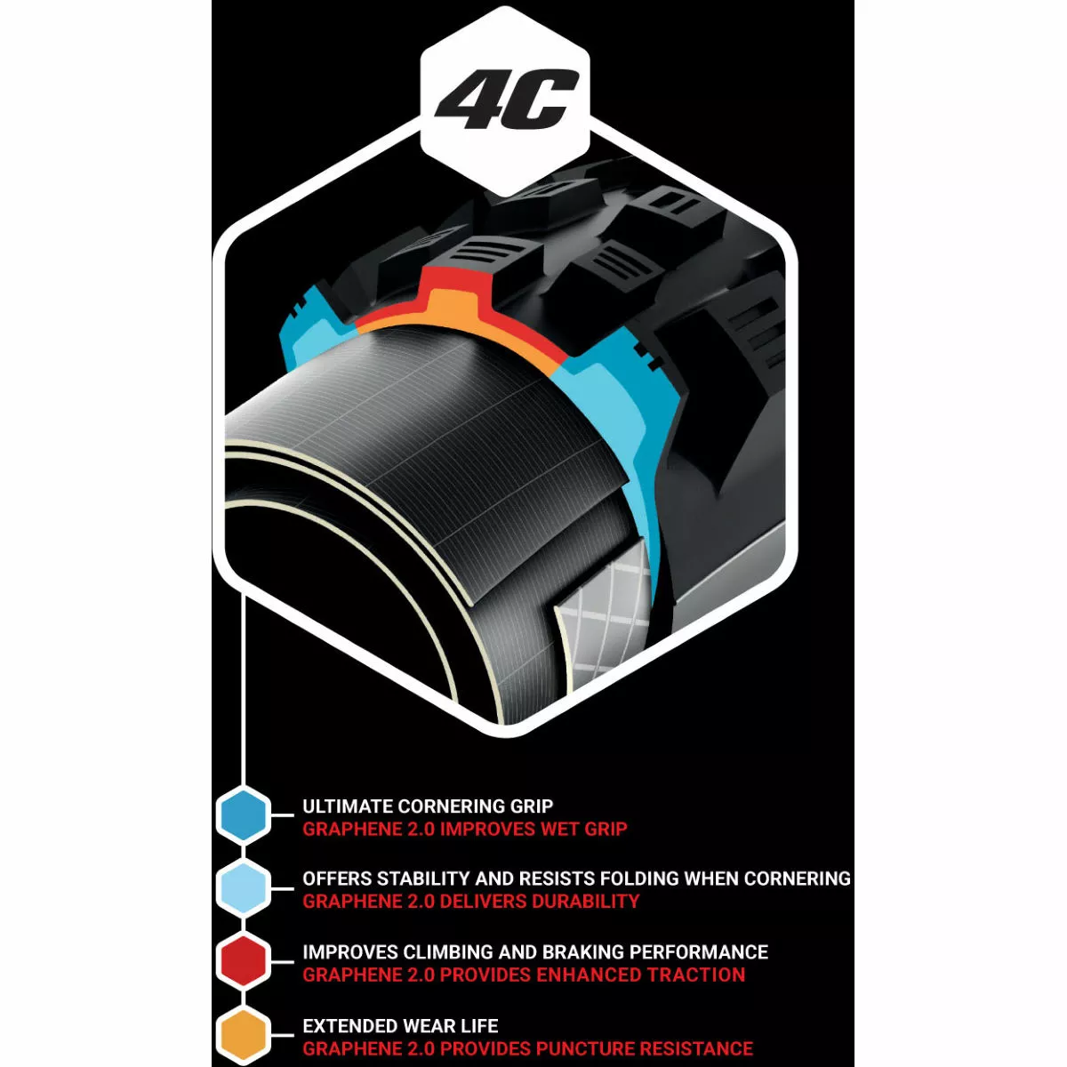 4C Compound: Exclusively developed by Vittoria and achieves high-end performance. The 4C is a layering process using 4 separate rubber compounds within the same tread. The 4C construction provides unmatchable versatility in both the central and side tread areas. The finished product is extensively tested to ensure it meets the competition level performance that road and off-road cyclists demand, and benefits the rider significantly, providing better rolling efficiency, better grip and puncture protection.